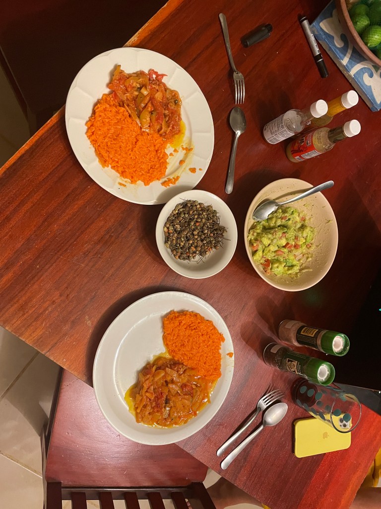Last dinner in our little shack. Tomatos, zucchini with tons of onions and garlic. Rice , guacamole and chiltepin as sides. We had this four or five times in a row because we loved it so much.