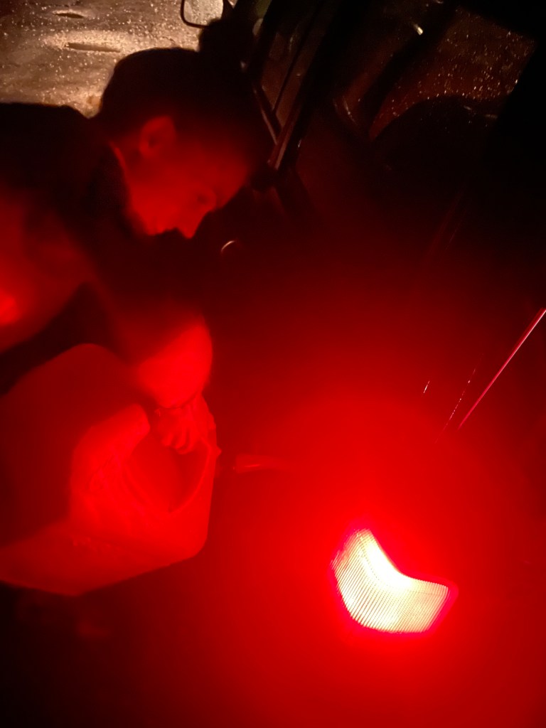 but again we did not plan accommodation so we drove through utter darkness until, wait for it, we ran out of gas. But professional campers that we are, we had a spare 20 liters with us. Lu took care of it while i tried to take pics in the rain.