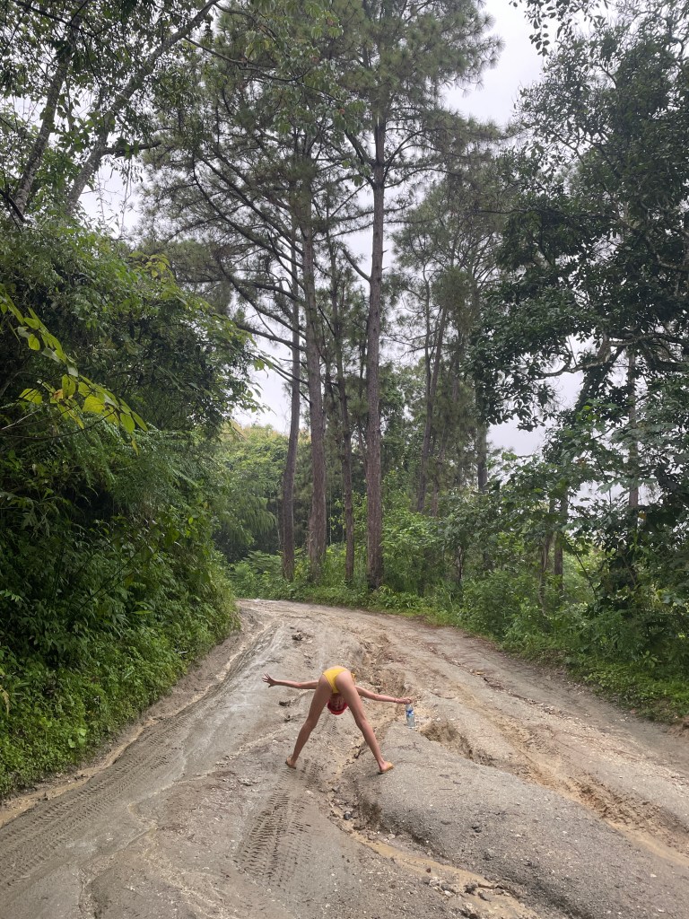So up the road we drove for a while before realizing that at least the second piece of advise was a good one. So we left the car on the side of the road and headed up a muddy dirt road by food.Armed with a plastic bag for our phones, flip flops,a bikini and some swimshorts. Everyone who saw us on the way either thought we had just escaped a mental institution or casually just looked the other way. Here you do get a good sense of the madness , less so of the rain that was constantly pouring down at every stage of our climb.